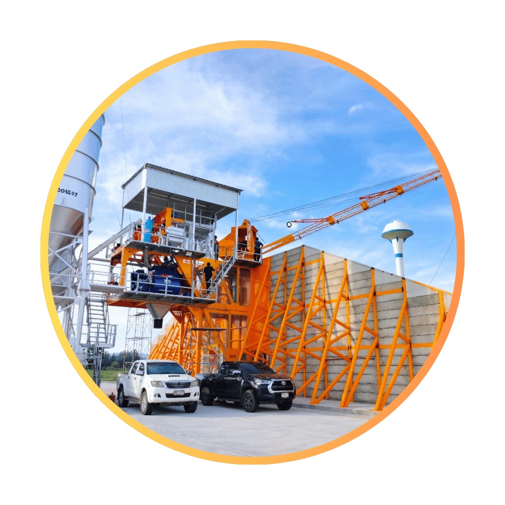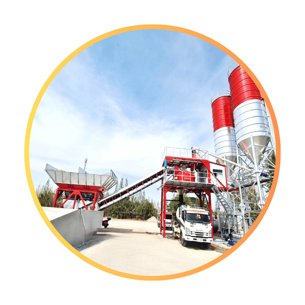 โมบายคอนกรีตแพล้นท์ แบบใช้ล้อลาก ลำเลียงหินทรายขึ้นโม่ด้วยสายพาน สต็อกหินทรายบนยุ้ง 2-4 ช่อง